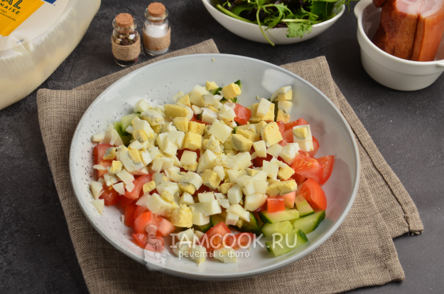 Очистите от скорлупы вареные яйца и нарежьте небольшими кусочками, отправьте в миску к овощам.