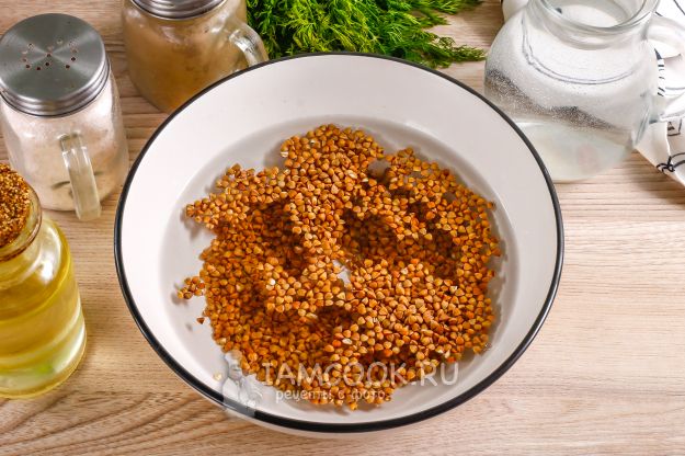 Гречневую крупу высыпьте в глубокую емкость и залейте водой, промойте несколько раз.
