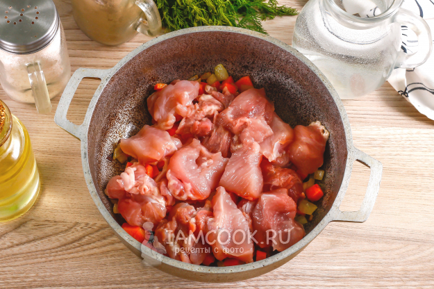 В это время промойте мясо индейки, срежьте жилы и пленки с него. Нарежьте порционными кусочками (чем мельче кусочки, тем быстрее приготовится блюдо). Добавьте нарезку мяса в казан и перемешайте. Поджарьте еще 1-2 минуты, чтобы мясо по краям запечаталось, а внутри осталось сочным.