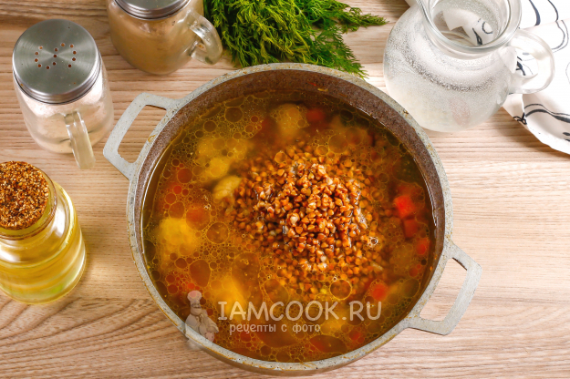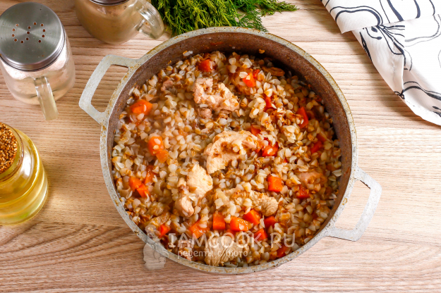 Затем всыпьте в казан промытую гречку и добавьте соль. Можно всыпать немного приправы для курицы или другие специи, пряности. Доведите содержимое емкости до кипения, затем убавьте нагрев до умеренного и накройте емкость крышкой. Отварите 15 минут.