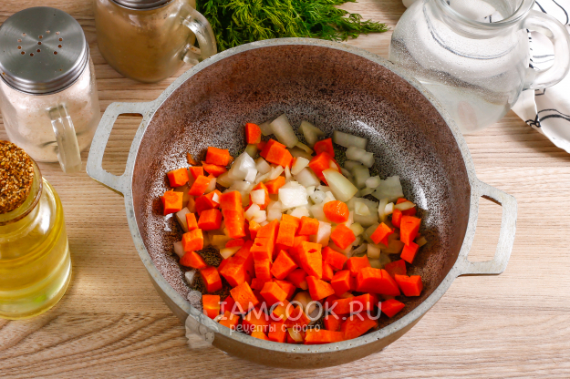 Очистите от кожуры лук и морковь, промойте овощи в воде и нарежьте их половинки мелким кубиком. Прогрейте в казане или кастрюле с антипригарным дном растительное масло и всыпьте в емкость овощные нарезки. Обжарьте примерно 3-5 минут до мягкости.
