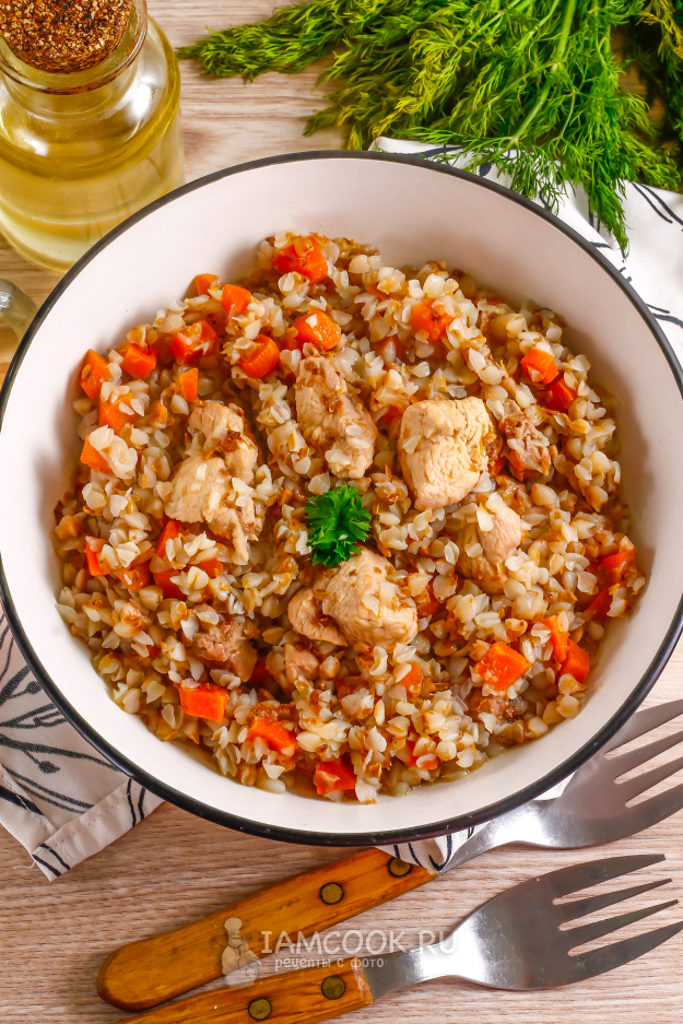 Выложите горячую гречку с индейкой и овощами на тарелку и подайте к столу, украсив свежей зеленью. Особенно вкусна такая гречка с соленьями!