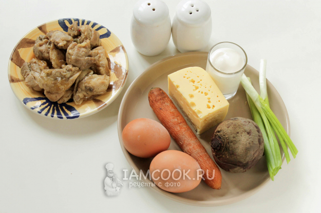 Подготовьте ингредиенты для слоеного салата «Адмирал» с курицей и свеклой. Предварительно отварите и остудите куриное мясо, свеклу, морковь и яйца — потребуется около часа, дольше всего варится свекла, как самый плотный, твердый корнеплод. В итоге времени на нарезку и сборку уйдет не более 10 минут. Плюс 15-30 минут на пропитку, и закуска готова к подаче.
