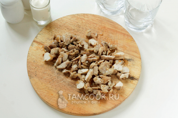 Отварную холодную курицу порубите кусочками не слишком крупно. Если нужно, приправьте специями. Куриный слой — основа салата «Адмирал». Разложите по порционным емкостям, смажьте майонезом.