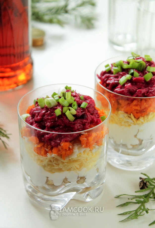 Порционный слоеный салат «Адмирал» с курицей и свеклой готов. Перед подачей украсьте порубленным зеленым луком.