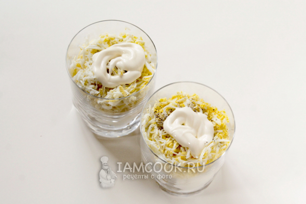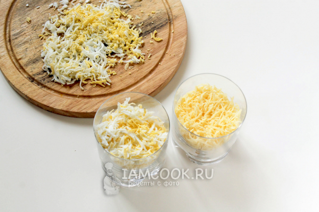 Следующим идет яичный слой. Также продавите яйца вкрутую на терке или покрошите мелко. Накройте сыр.