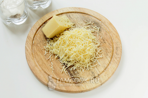 Тонкой стружкой натрите сыр твердых сортов. Накройте мясо/курицу с майонезом.