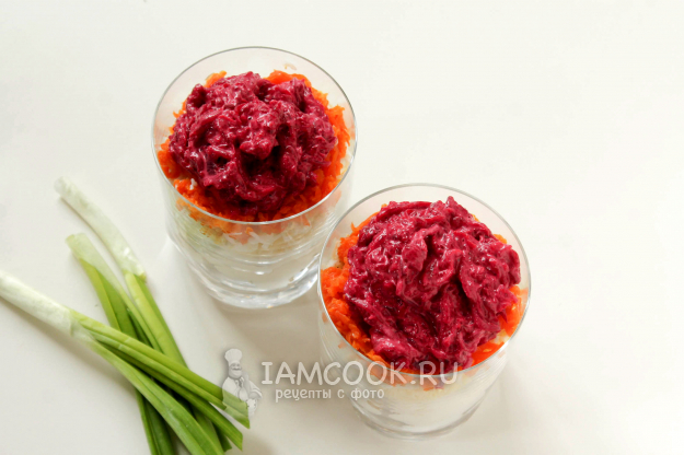 Вареную свеклу натрите тем же размером и смешайте с небольшой порцией майонеза, специй - таким образом верхний слой салата не подсохнет.