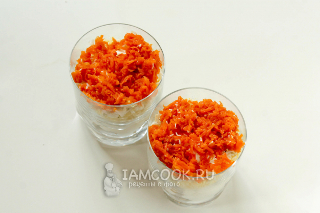 Потом распределите тертую вареную морковь — с ней салат ярче и вкуснее.