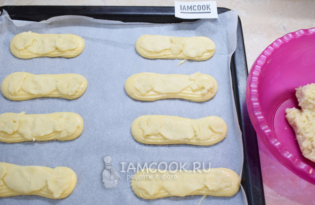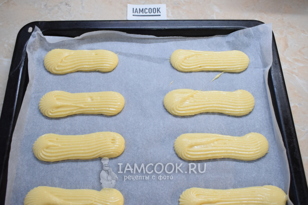 С помощью кондитерского мешка с насадкой отсадите на противень для выпечки небольшие эклеры, длиной 12-15 см.
