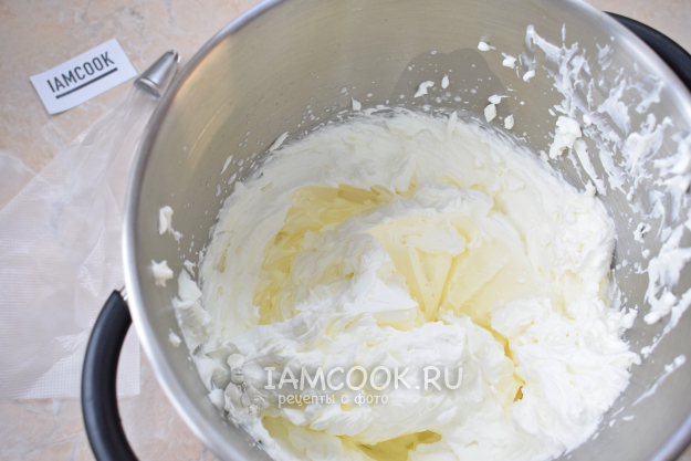 Для приготовления крема соедините охлажденные жирные сливки с сахарной пудрой и взбейте на максимальной скорости миксера до получения пышной стабильной массы.