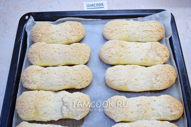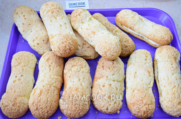 Готовые эклеры увеличатся в размере и станут золотистого цвета. При выпечке духовку открывать нельзя, иначе эклеры опадут.