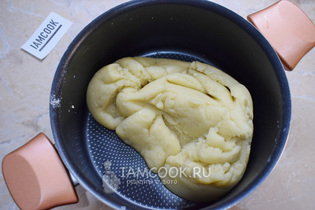 Тесто оставьте остыть до теплого состояния. Периодически его перемешивайте, чтобы оно быстрее остывало.