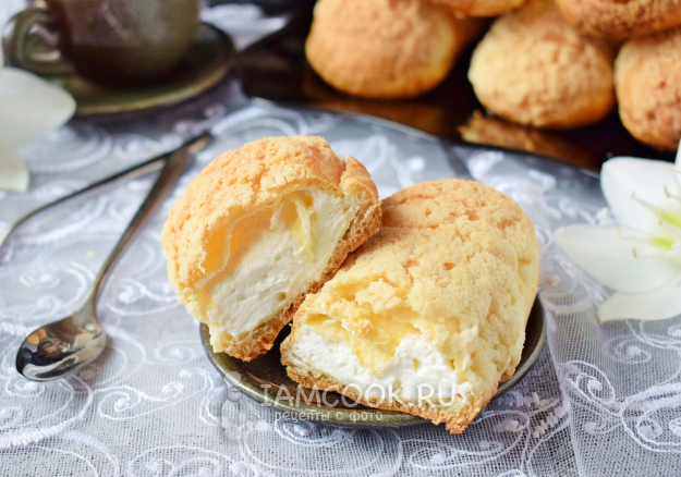 Эклеры прорежьте с одного бока и наполните сливочным кремом.