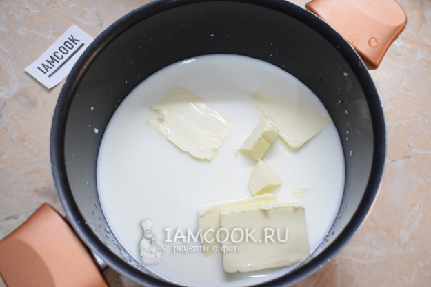 Для приготовления заварного теста удобнее всего использовать антипригарную посуду. У меня это кастрюля. Налейте в неё молоко и воду. Добавьте необходимое количество сливочного масла и поставьте на огонь. Доведите все до кипения и оставьте на огне еще на 2-3 минуты, чтобы сливочное масло полностью растаяло.