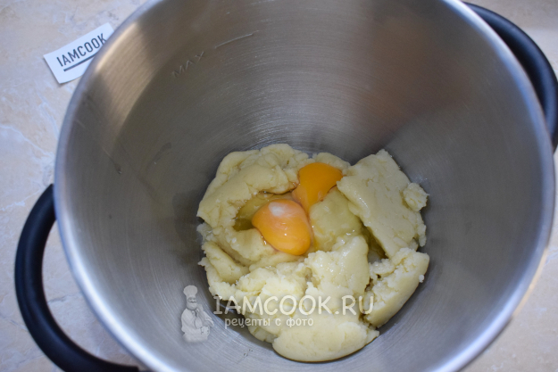 В остывшее тесто добавляйте яйца по одному. Каждое яйцо вмешивайте в тесто. Яиц может уйти чуть больше. Ориентируйтесь на консистенцию готового теста.