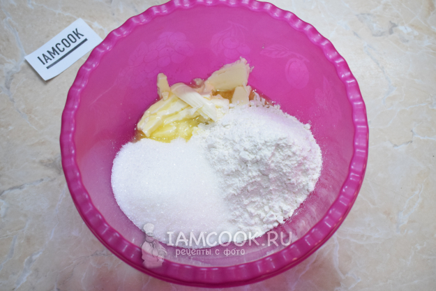 Для этого соедините в чаше мягкое сливочное масло, сахар и муку. Все перемешайте руками.