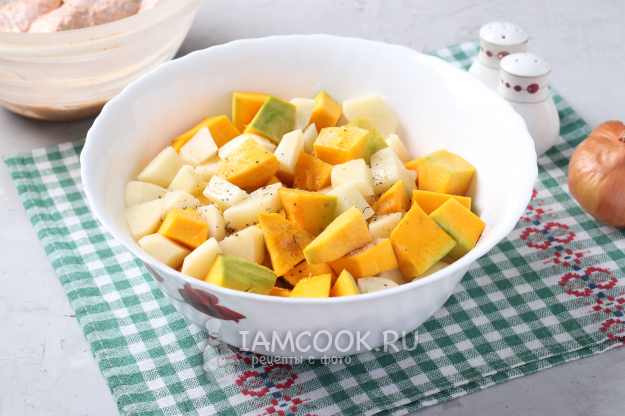 В форму для запекания выложить тыкву с картофелем, сверху разложить лук.