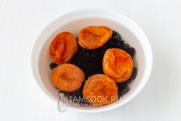 Первым делом залейте сухофрукты кипятком и отставьте в сторонку минуток на 10.
