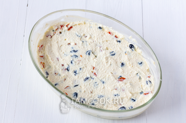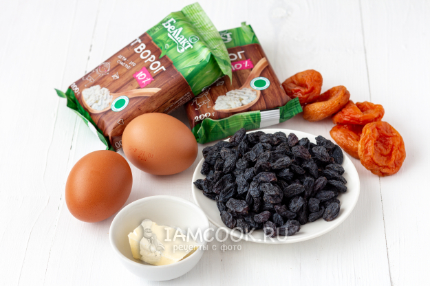 Для приготовления творожной запеканки с изюмом и курагой подготовьте необходимые продукты по списку ингредиентов.