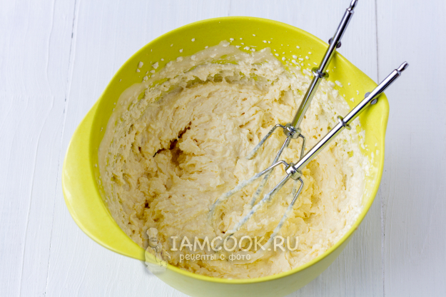 Затем добавьте творог и размешайте творожную массу. Можно это сделать и миксером, но важно делать это быстро, чтобы взбитые яйца не сильно опали и творожная масса была пышной.