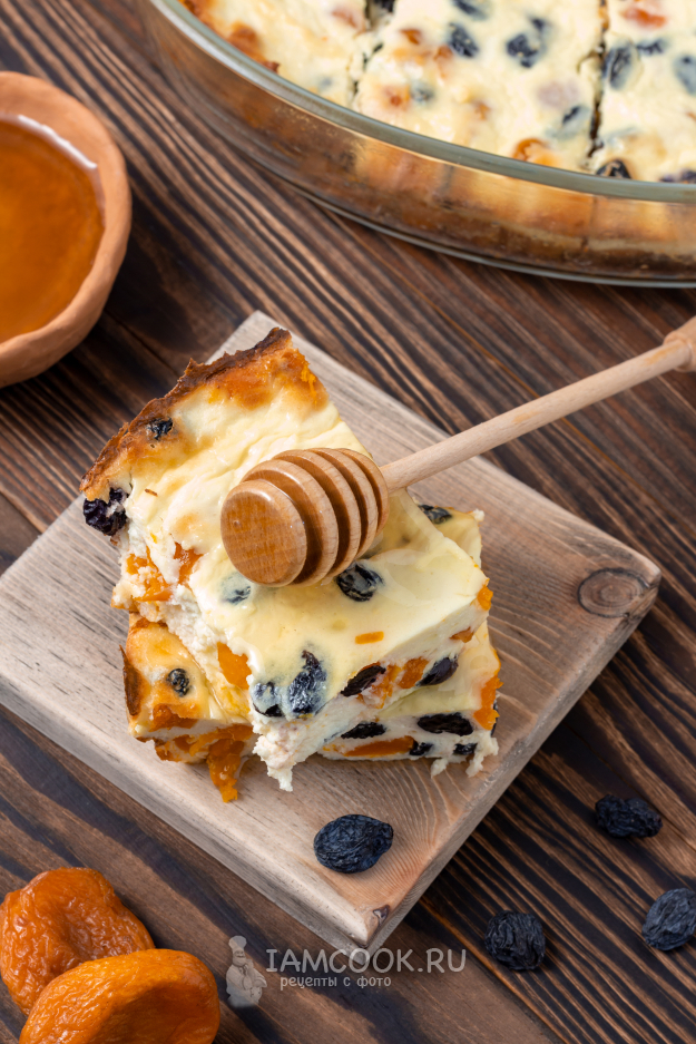 Творожная запеканка с изюмом и курагой готова! Запеканке нужно дать немного времени остыть и стабилизироваться. А потом смело делите на кусочки и подавайте на стол.