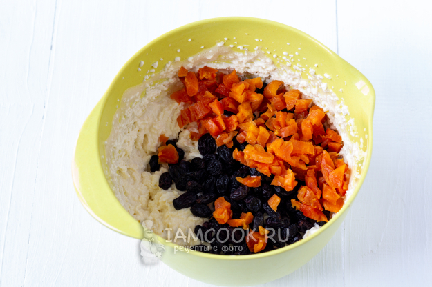 Далее измельчаем ножом курагу. Кладем сухофрукты к творожной массе и аккуратно их вмешиваем.