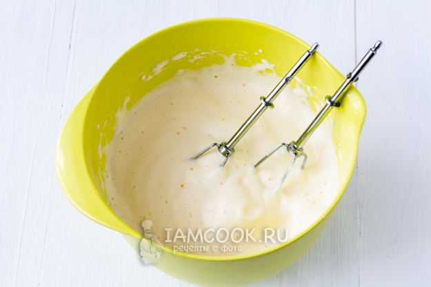 Яйца вбейте в миску и взбейте миксером до пышной массы. У меня на это ушло 5 минут. При желании на этом этапе можно добавить сахар, ванилин или ванильный сахар.