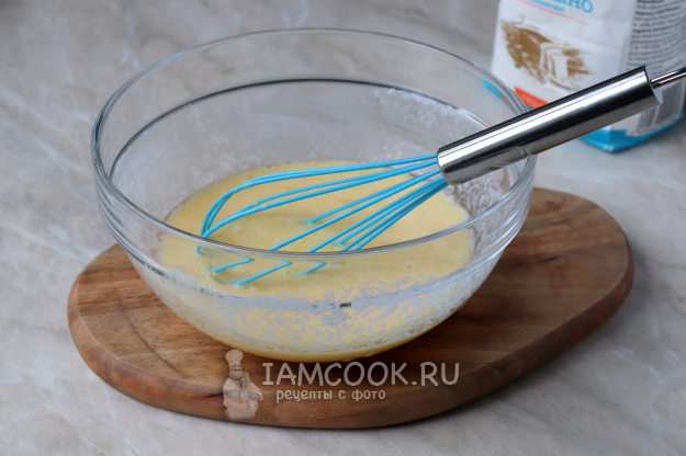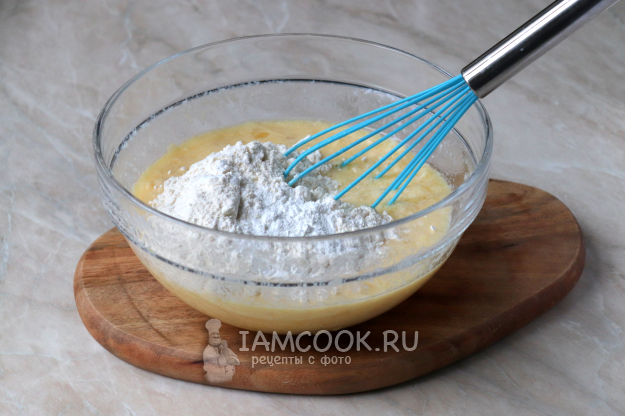 Введите просеянную пшеничную муку и разрыхлитель. Снова перемешайте.