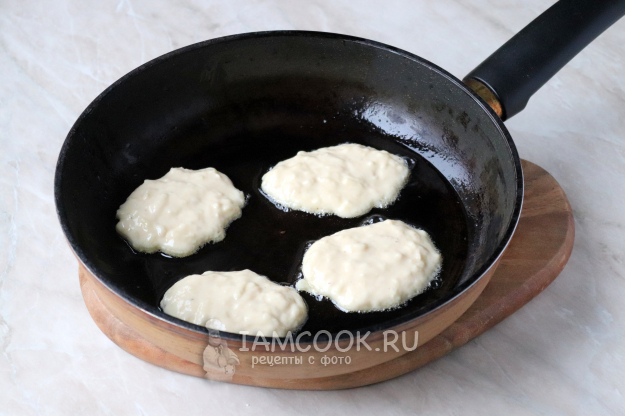 Разогрейте сковороду, налив порцию растительного масла. Затем выложите столовой ложкой тесто, формируя небольшие лепёшки.