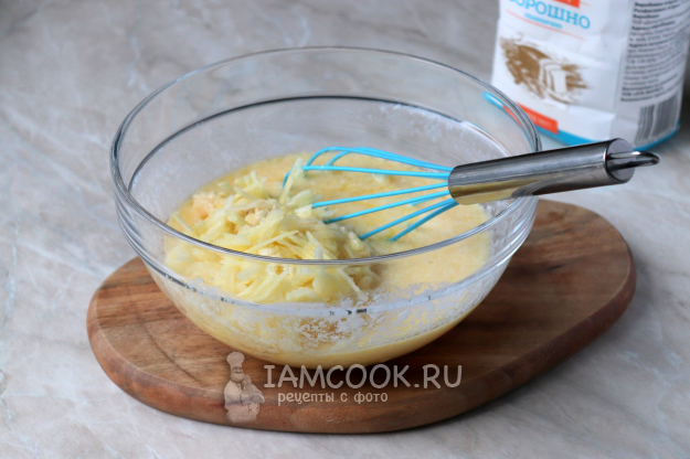 Почистите яблоко и банан от кожуры. У яблока ещё удалите семенную коробочку. Затем мякоть фруктов натрите на крупной тёрке. Получившуюся стружку добавьте в жидкую основу. Перемешайте.