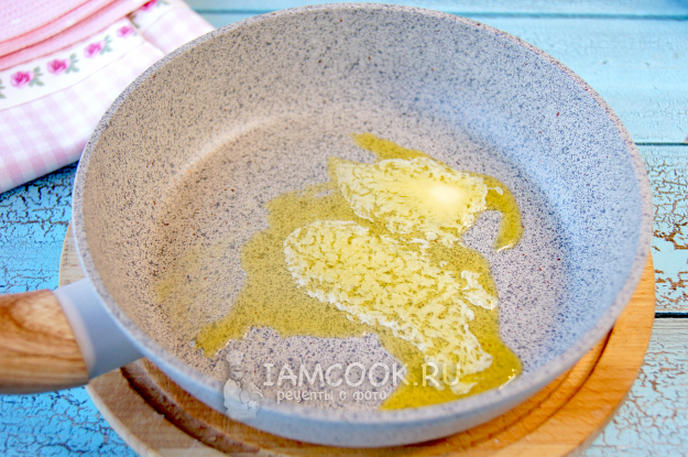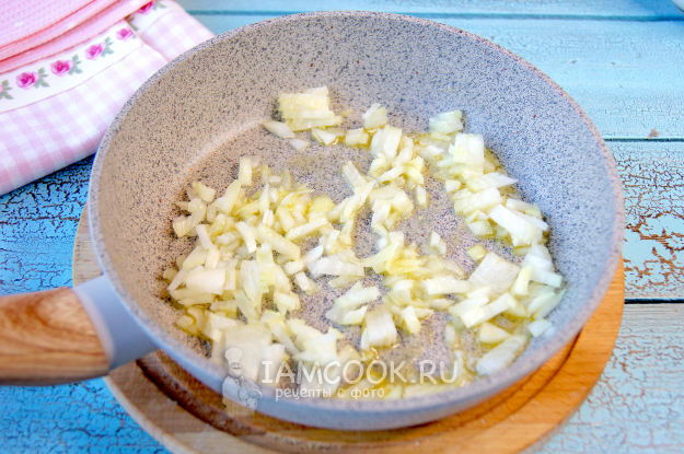 Лук очистите и мелко нарежьте, выложите в сковороду и обжарьте, помешивая, до румяности на среднем огне.
