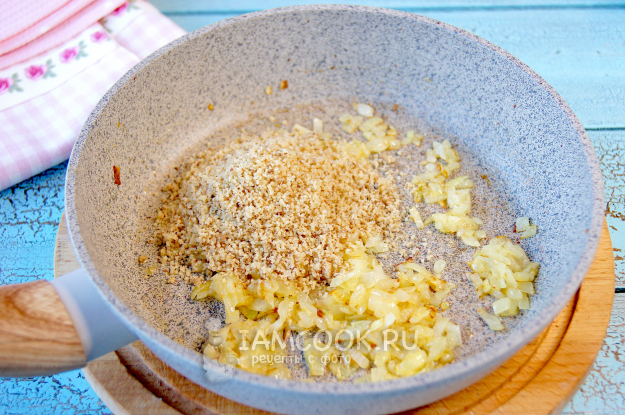 Орехи измельчите при помощи блендера в мелкую крошку и выложите в сковороду. Прогрейте, помешивая, на среднем огне около 2-3 минут.