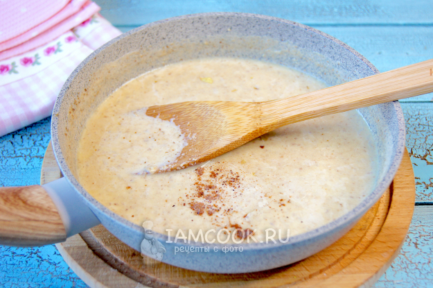 Не снимая с огня, влейте сливки и молоко. Добавьте пармезан, мускатный орех и посолите по вкусу. Помешивая, проварите около 5 минут, за это время соус слегка загустеет.