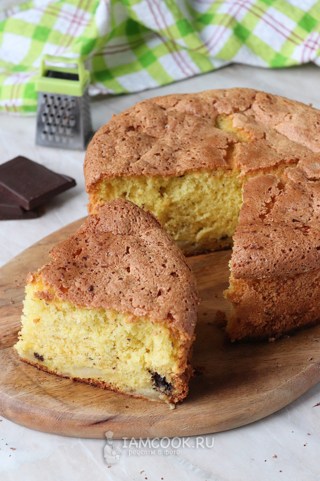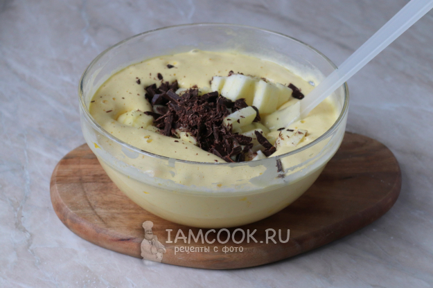 Очищенное яблоко нарежьте произвольными кубиками, шоколад порубите ножом (должны получиться небольшие кусочки или крупная стружка). Яблоки и шоколад добавьте в миску с тестом и снова перемешайте, по направлению снизу-вверх, стараясь максимально сохранить пузырьки воздуха, образовавшиеся во время взбивания яиц.