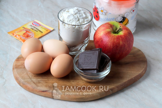 Чтобы приготовить шарлотку с яблоками и шоколадом, возьмите все необходимые продукты по списку. Шоколад я использовала чёрный, вы же можете взять белый или молочный. Пшеничную муку просейте через мелкое сито, а яйца заранее достаньте из холодильника - они должны быть комнатной температуры.