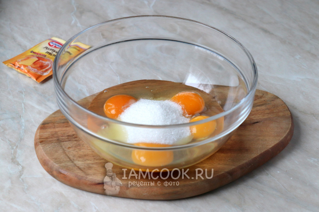 Вбейте яйца в объемную миску. Туда же добавьте указанную порцию сахара.