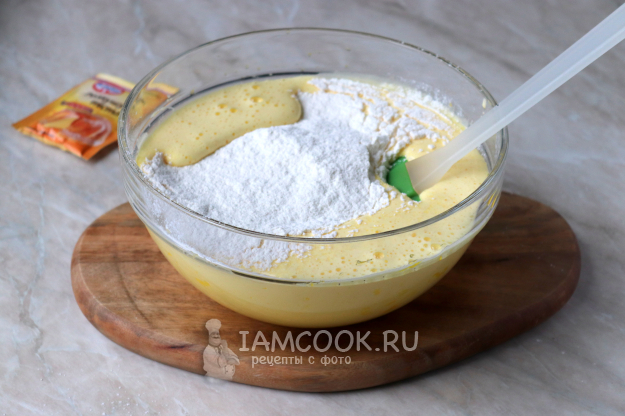 Затем введите подготовленную пшеничную муку и разрыхлитель. Аккуратно перемешайте, чтобы вся мука увлажнилась и не было мучных комочков.