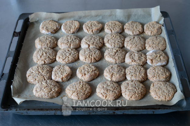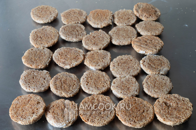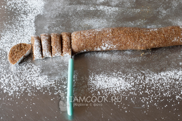 Обсыпать рабочую поверхность сахарной пудрой, как мукой, взять пригоршню теста, сформировать из неё колбаску, раскатать и нарезать на шайбочки. Для печенек среднего калибра это количество теста делится на 4 колбаски, для более крупных - на 3, для более мелких - на 5.