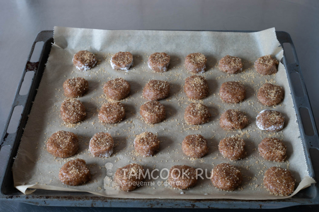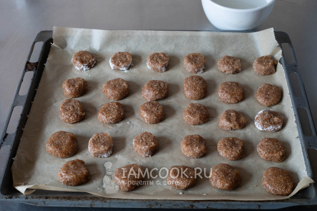 Смоченными в воде руками придать заготовкам из миндального теста форму шайбочек и перенести на противень, покрытый кондитерской бумагой. Из этого количества теста получится где-то два противня изделий.