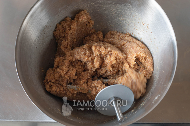 Для приготовления теста вмешать в белки миндальную муку и коричневый сахар. Мешать до тех пор, пока не получится густая однородная масса.