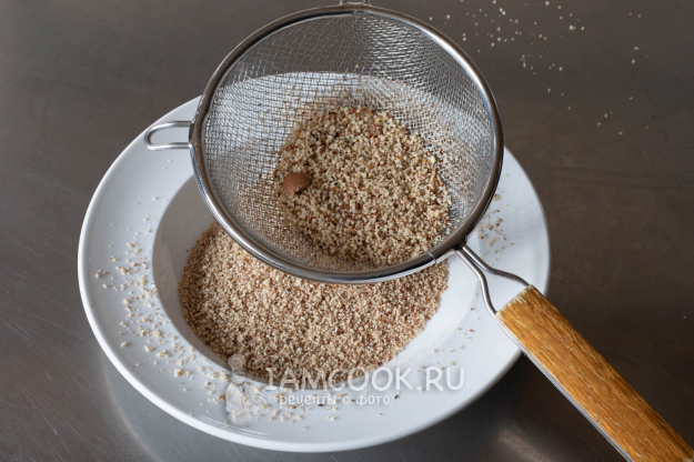 Миндальную муку имеет смысл просеять. Во-первых, это избавит вас от неприятных сюрпризов вроде скорлупок, а во-вторых, возможно, вы поймёте, что имеет смысл промолоть особенно крупные кусочки дополнительно.