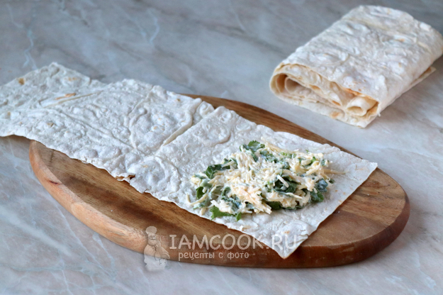 Лаваш разрежьте на 4 длинных полосы. Затем на край заготовок выложите по столовой ложке начинки (как на фото).