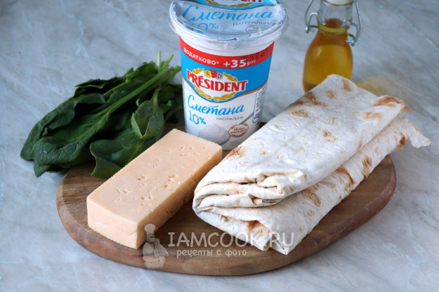 Подготовьте все продукты для приготовления треугольников из лаваша со шпинатом и сыром на сковороде. Шпинат заранее промойте под холодной проточной водой и обсушите бумажными полотенцами.