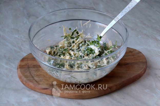 Тщательно перемешайте. Соль в начинку я не добавляла - сыр и так солёный, вы же ориентируйтесь по своему вкусу.