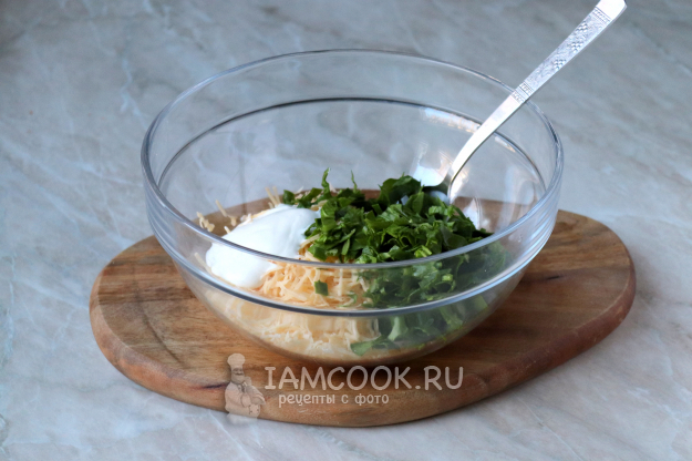 Твёрдый сыр натрите на тёрке, добавьте к нему сметану и мелко нарезанный шпинат.