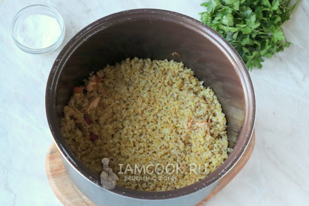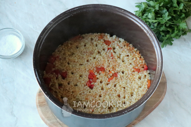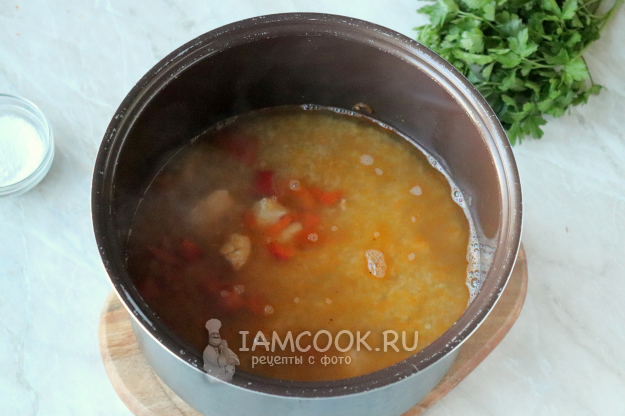Содержимое чаши зальем кипятком (в соотношении 1:2). Если нужно, добавим ещё соли. Закроем крышку и выберем режим "Рис/крупы".