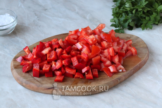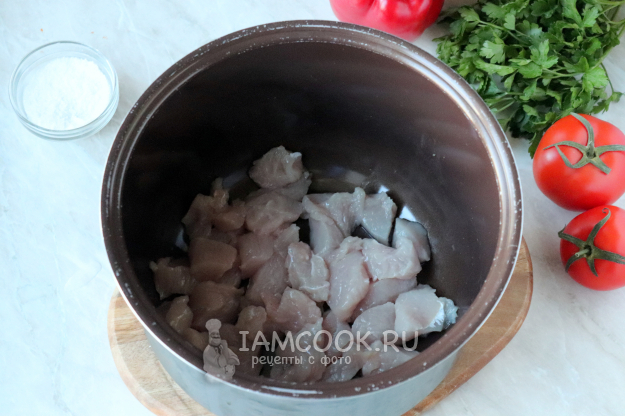 Следующими в чашу мультиварки отправляем помидоры и болгарский перец. Нарезать их можно кубиками или же соломкой. Мясо с овощами солим (также можно добавить любые специи, которые вам нравятся), перемешиваем и готовим ещё 5 минут.