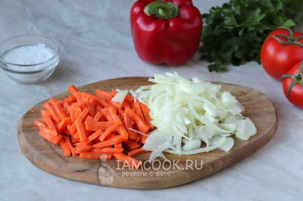 Тем временем измельчим овощи. Лук нарежем полукольцами, морковь - длинными брусочками. Отправим нарезку к мясу. Будем готовить всё вместе до их мягкости, примерно 5 минут. Не забывая помешивать, чтобы ничего не пригорело.