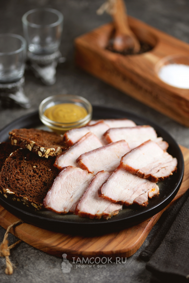Готовую грудинку аккуратно извлеките из пакета, отрежьте небольшой кусок с мясной стороны.